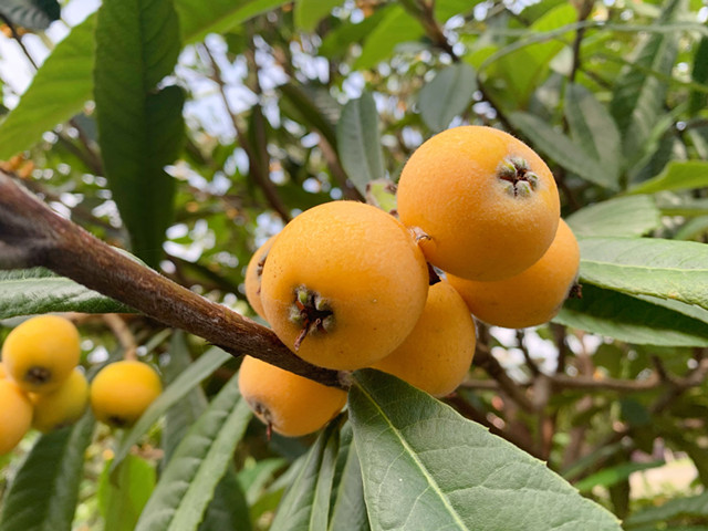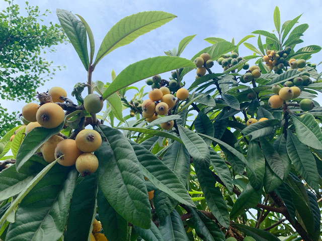 走zou近jin枇pi杷pa樹shu的de一yi瞬shun間jian,空kong氣qi中zhong甜tian甜tian的de水shui果guo香xiang味wei撲pu鼻bi而er來lai,綠lv油you油you的de枇pi杷pa樹shu葉ye迎ying著zhe陽yang光guang盡jin情qing展zhan開kai著zhe,葉ye子zi之zhi間jian下xia麵mian鑲xiang嵌qian著zhe一yi顆ke顆ke成cheng熟shu金jin黃huang的de枇pi杷pa。