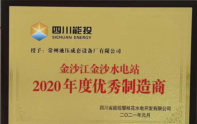 喜訊 | 常州液壓成套設備廠有限公司榮獲“金沙江金沙水電站2020年度優秀製造商”稱號!