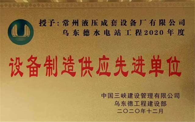 近日,中國三峽建設管理有限公司烏東德工程建設部召開2020年度設備製造供應先進單位表彰大會。常州液壓成套設備廠有限公司以優質的產品和優異的服務在眾多供應商中脫穎而出,繼2019年獲得“設備製造供應先進單位”稱號之後,再次蟬聯此殊榮。常州液壓作為中國三峽建設管理有限公司烏東德水電站項目液壓啟閉機成套設備供應商